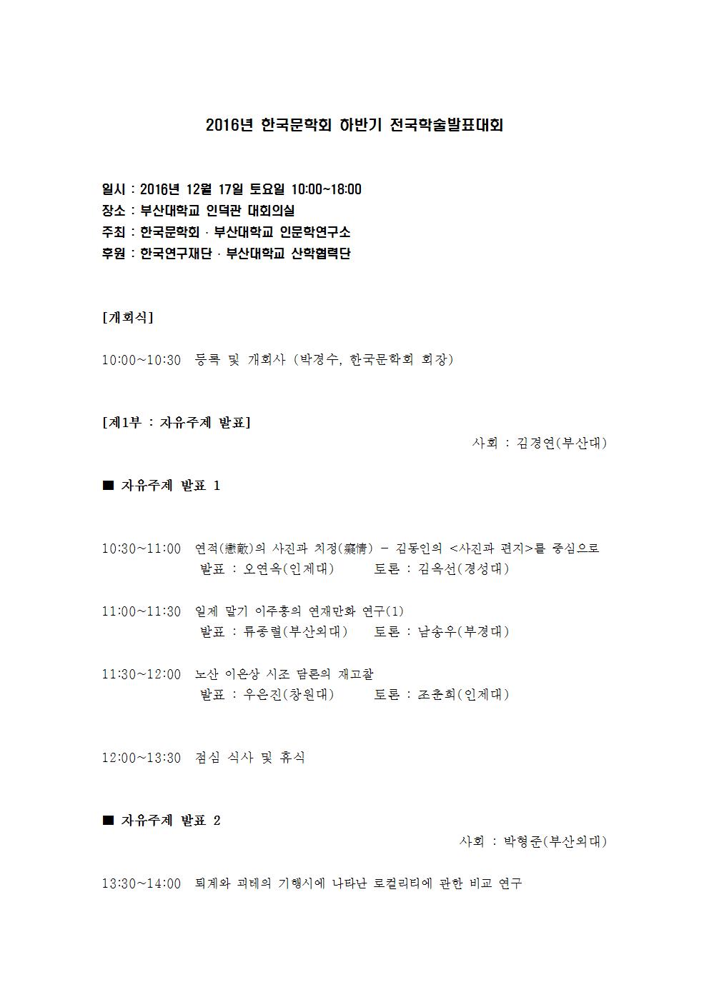 2016년 한국문학회 하반기 전국학술발표대회 개최 안내